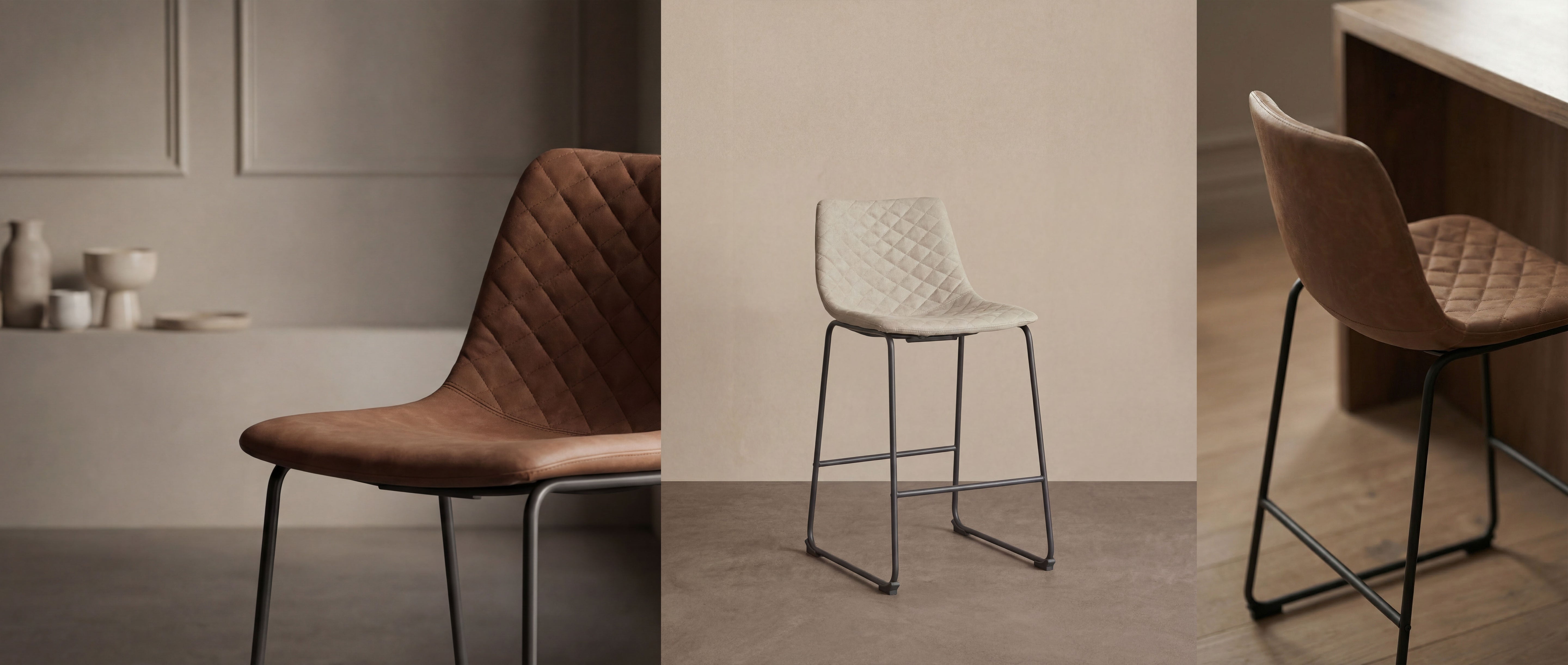 Set de dos taburetes altos tapizados con detalles color café con una altura de 65 cm.