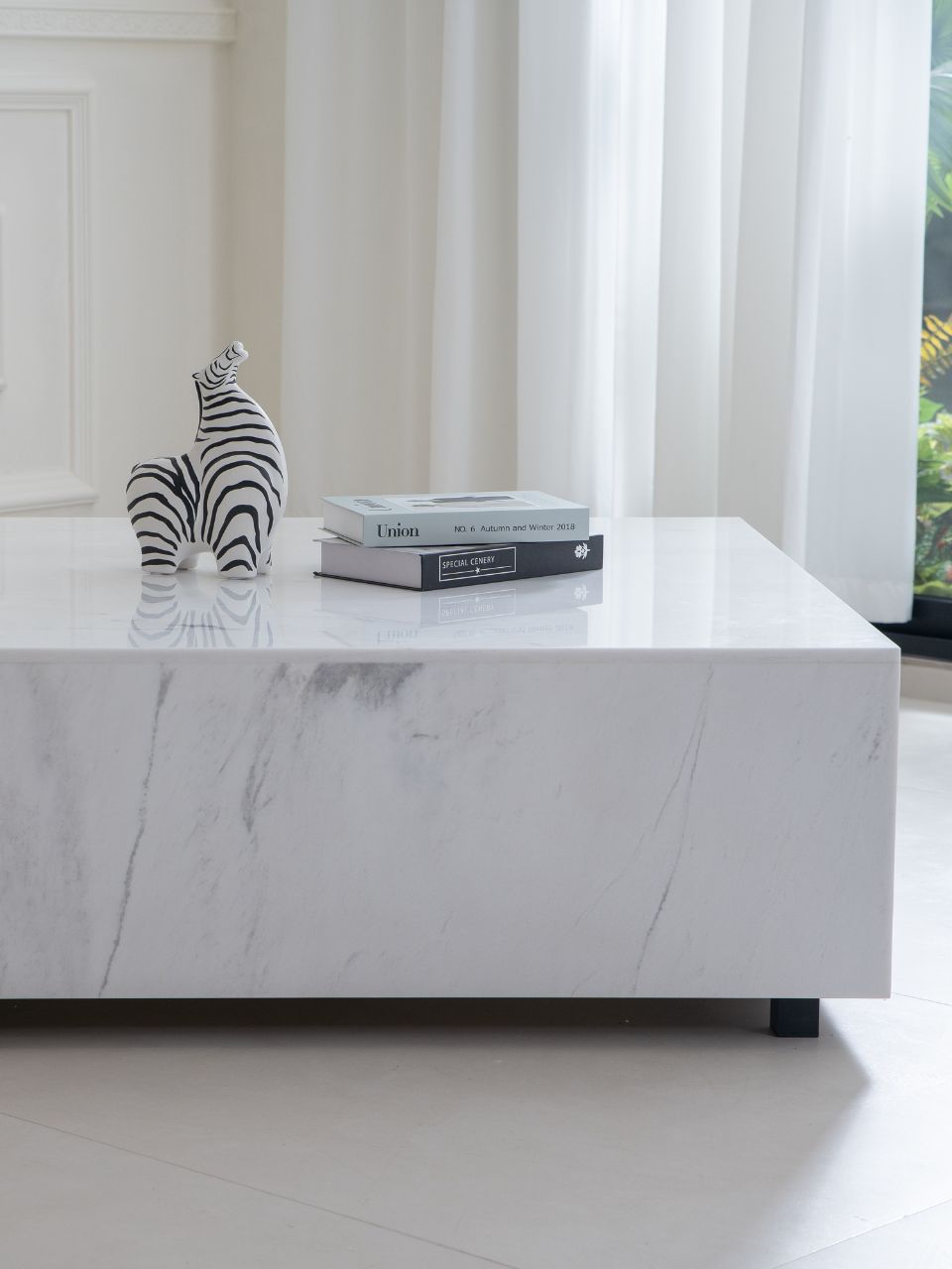 Añade libros de arte y un jarrón de vidrio para un look editorial.