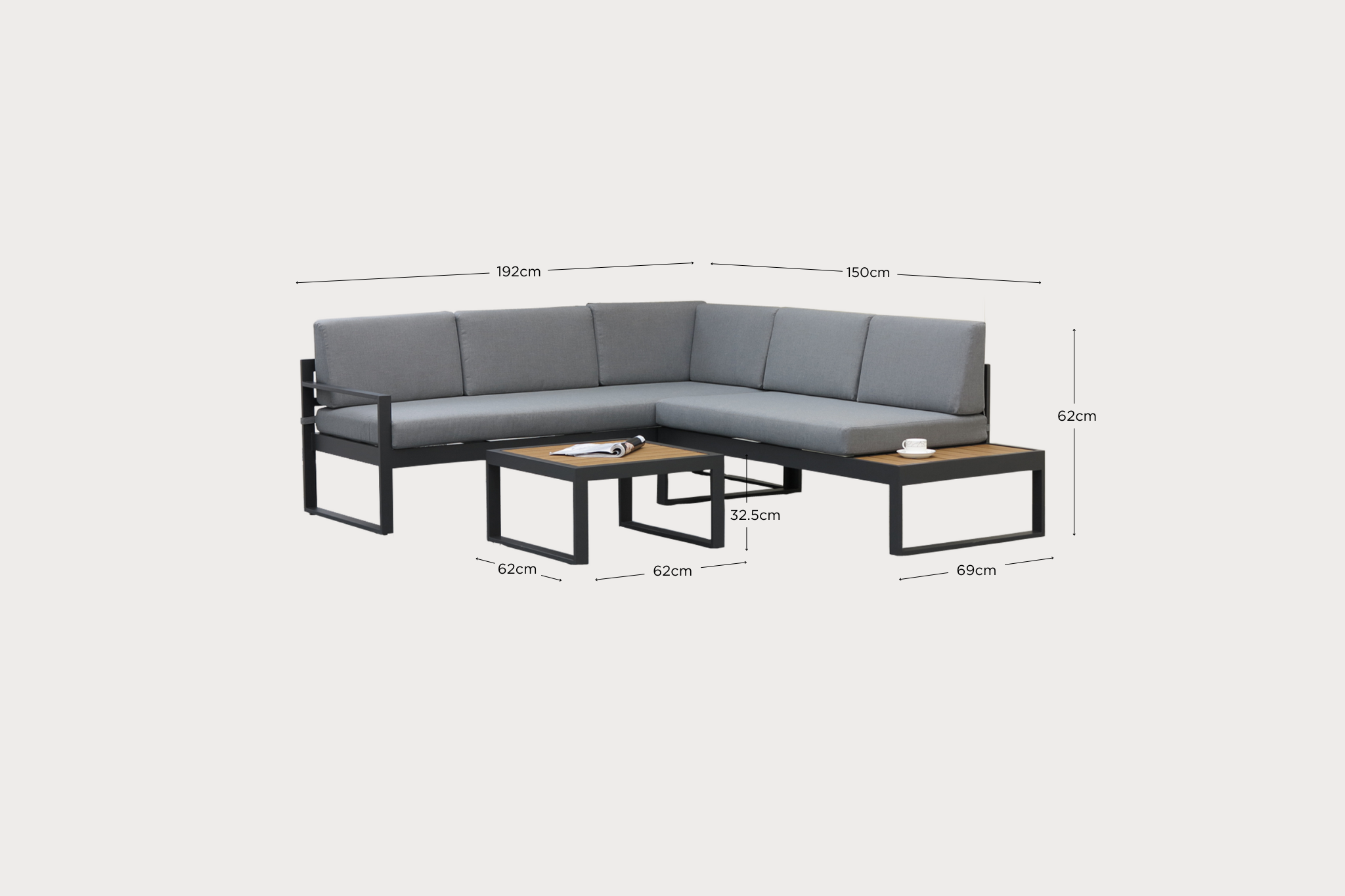 Compuesto por un sofá doble, un sofá triple y una mesa de centro, este conjunto ofrece un diseño moderno y acogedor, ideal para disfrutar del aire libre con estilo y comodidad. Su estructura de acabado negro aporta un toque sofisticado y contemporáneo, mientras que los asientos de madera brindan calidez y un aspecto natural, asegurando al mismo tiempo resistencia y fácil mantenimiento. La mesa de centro incluida complementa el conjunto con un espacio práctico para colocar bebidas, libros o accesorios decorativos, haciendo de este set una opción versátil para compartir momentos en exteriores.