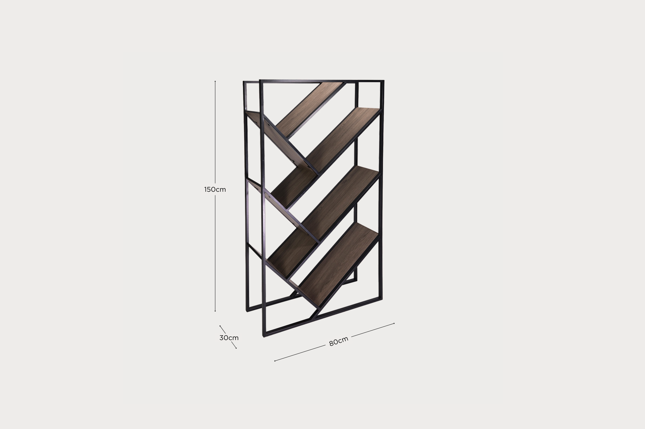 Cada estante está cuidadosamente diseñado para ofrecer un amplio espacio donde organizar y exhibir sus libros, arte decorativo y objetos personales. La madera utilizada en los estantes no solo aporta calidez y un toque orgánico al diseño, sino que también asegura una superficie resistente capaz de soportar un uso diario. Esta combinación de materiales resalta un contraste visual atractivo que realza la estética general de la librería.