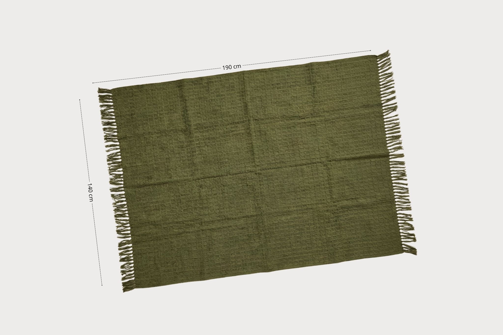 Esta manta decorativa de 140 × 190 cm destaca por su color verde, inspirado en tonos naturales, y por su tejido de textura marcada que aporta riqueza visual y una sensación acogedora al espacio. La trama regular del tejido crea un sutil relieve que realza su acabado artesanal y su estética sobria.