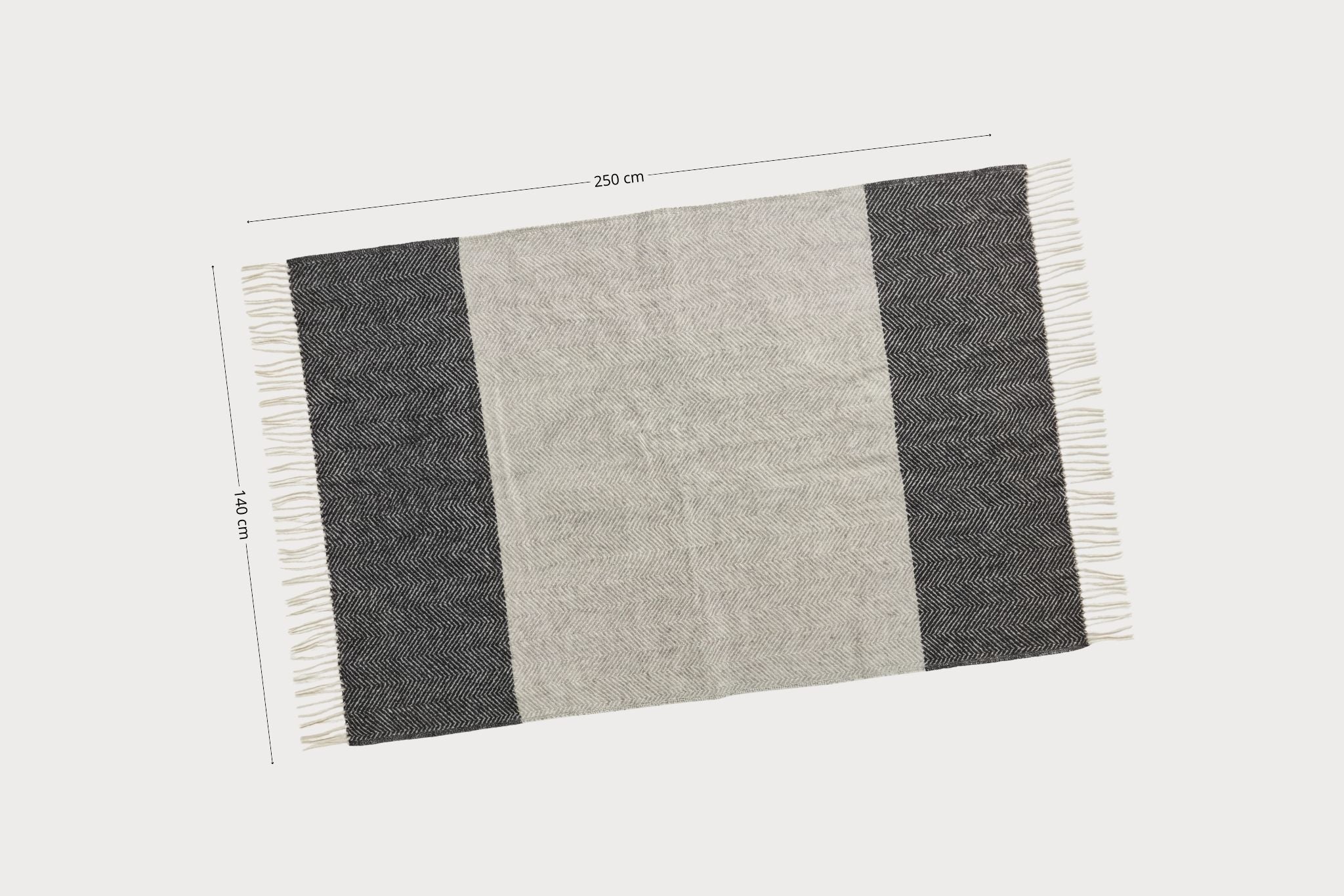 Manta decorativa de 140 × 250 cm con diseño bicolor y trama en espiga. Su formato amplio y el acabado con flecos la hacen ideal para sofás grandes o camas.