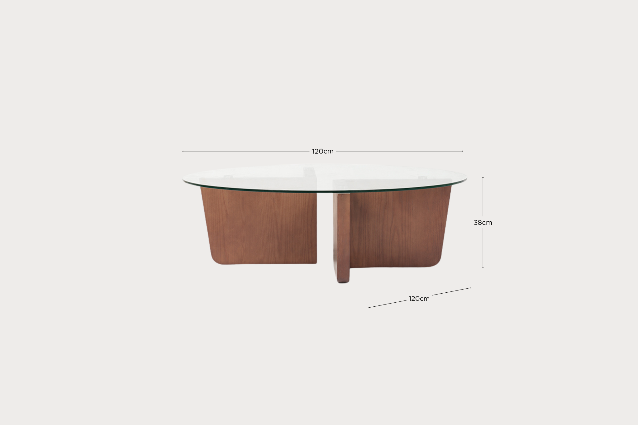 Su tablero redondo de vidrio no solo aporta un toque de elegancia y ligereza visual, sino que también garantiza resistencia y durabilidad, siendo una superficie práctica para el día a día. La base, formada por dos robustas patas en acabado de madera, añade calidez y estabilidad a la pieza, generando un contraste equilibrado entre lo moderno y lo natural.