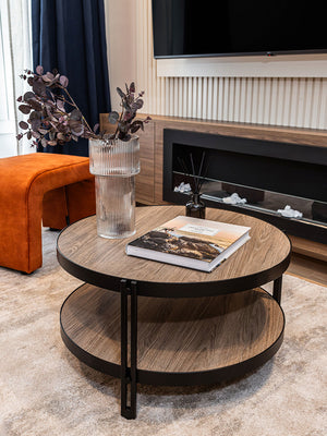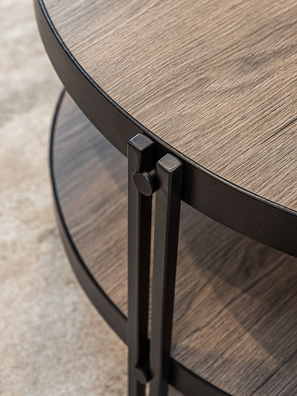 Mesa de centro redonda con dos estantes acabados en madera con estructura exterior de hierro