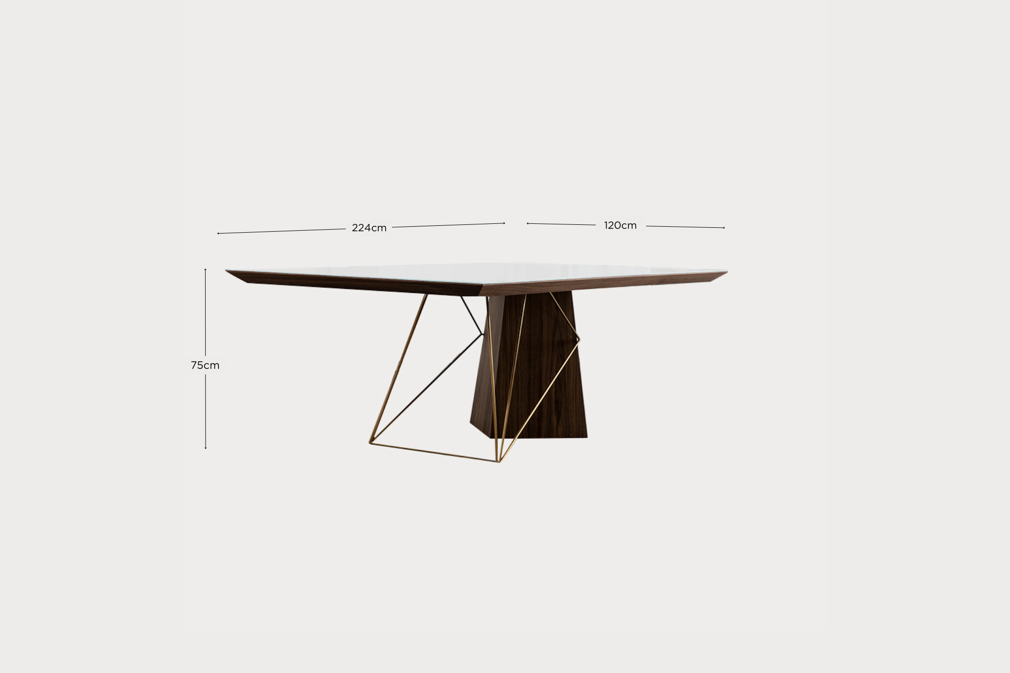 La mesa de comedor MARVIN destaca como una pieza central imponente y refinada que logra captar todas las miradas. Su diseño se caracteriza por una base de pedestal de líneas suaves y robustas que otorgan estabilidad y presencia a la mesa, ideal para añadir un toque de sofisticación a comedores de estilo contemporáneo o ecléctico. Los detalles metálicos en latón, integrados estratégicamente en la base, aportan un sutil brillo que contrasta de manera armoniosa con la calidez de la madera natural, logrando un equilibrio visual que evoca elegancia y modernidad.