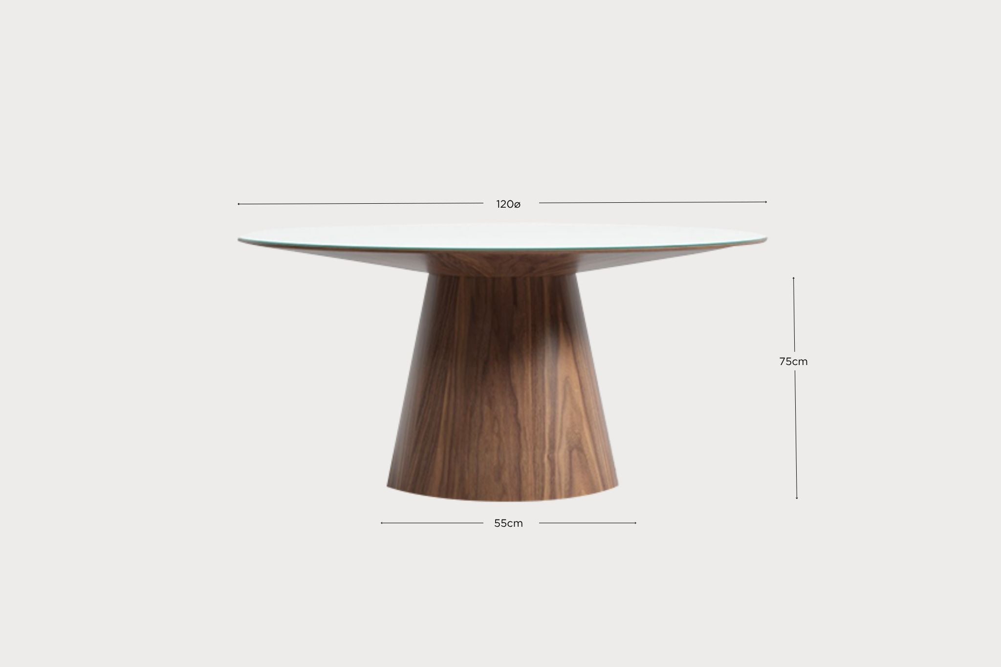 La de madera de fresno añade carácter y diseño a la pieza, creando un equilibrio perfecto entre lo funcional y lo elegante. Esta estructura robusta no solo asegura la estabilidad de la mesa, sino que también actúa como un elemento decorativo en sí mismo.