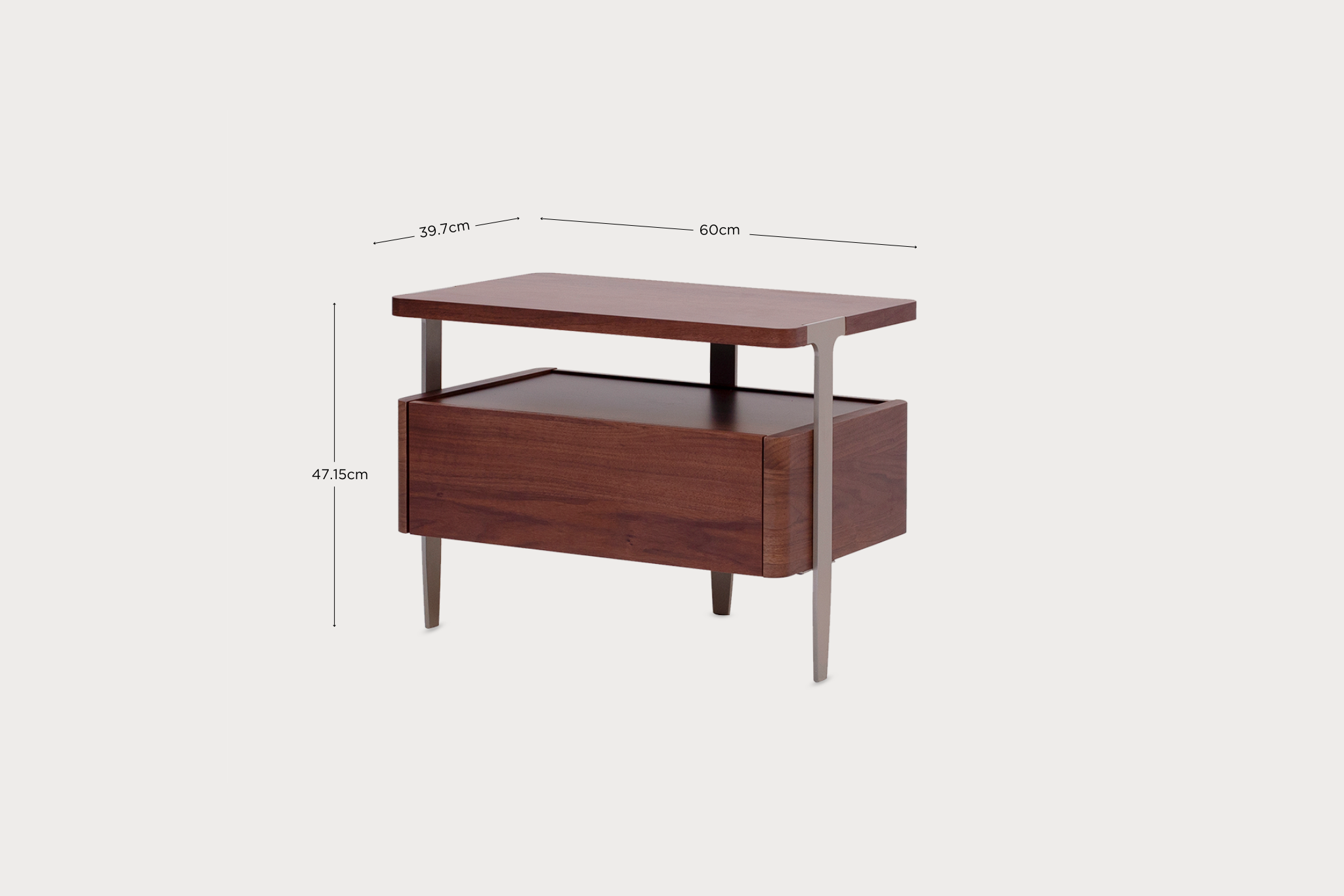 La mesita de noche DAMIEN es una cálida y sofisticada pieza empleada para agregar un toque de lujo a cualquier dormitorio. Esta elegante mesa presenta un cuerpo chapado en madera de nogal, que aporta una textura y un color cálido, creando una atmósfera acogedora y natural en tu espacio.