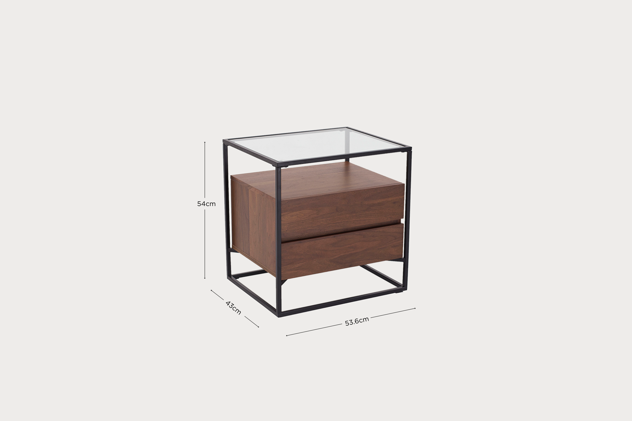 El cuerpo de la mesita de noche, chapado en madera de nogal, introduce una rica textura y un color cálido que contrastan elegantemente con el vidrio y el metal. Esta combinación de materiales no solo mejora la estética del mueble, sino que también asegura su durabilidad y funcionalidad.