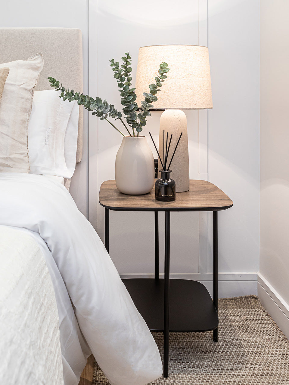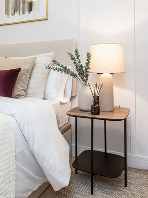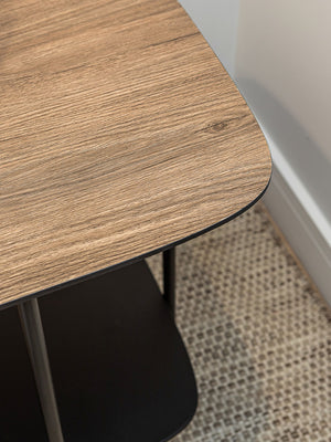 Mesa auxiliar chapada en madera con estante y estructura con un acabado negro
