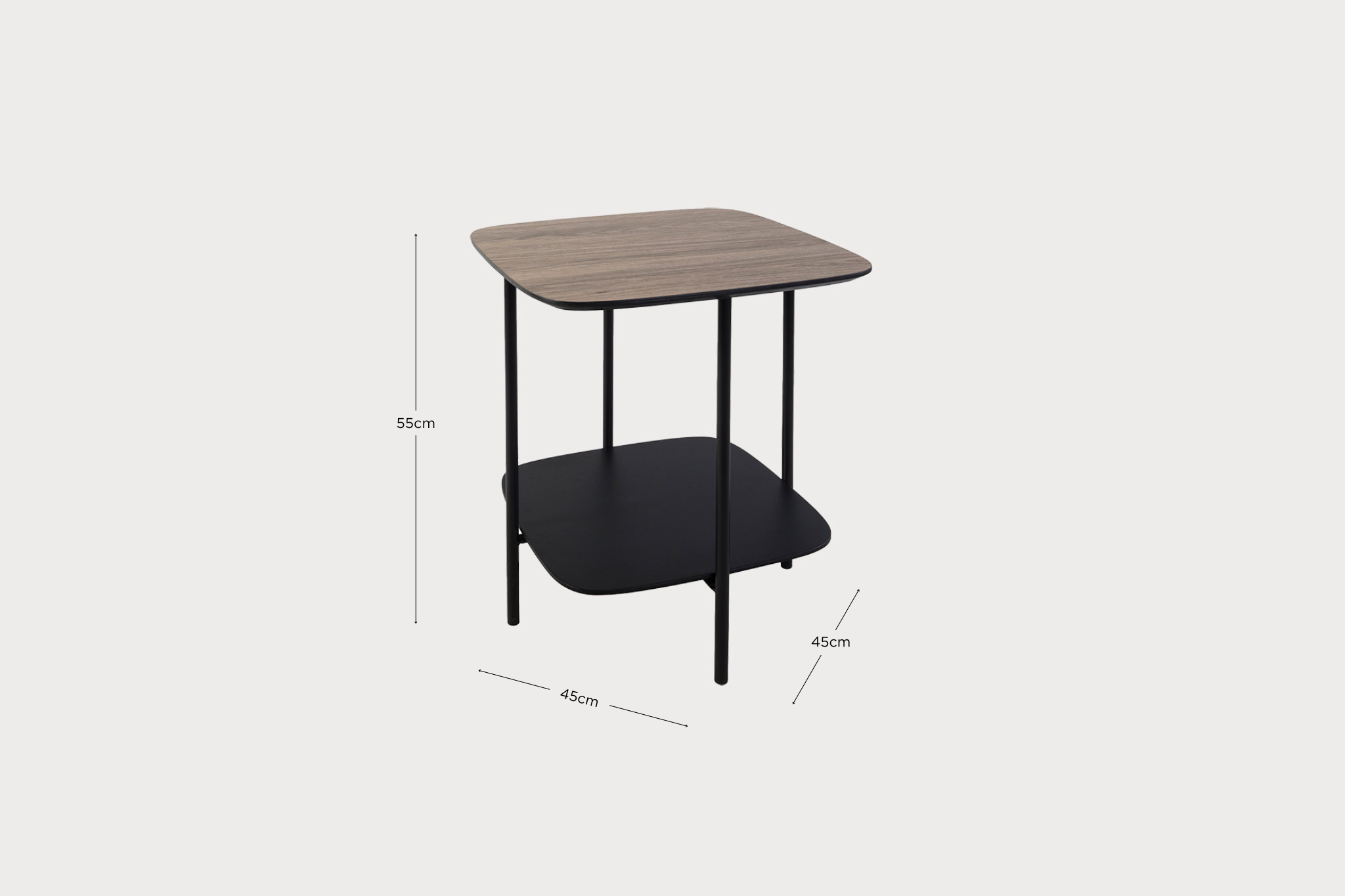 El tablero acabado en madera ofrece una superficie cálida y natural, ideal para combinar con cualquier diseño. Debajo del tablero principal, un estante en negro mate añade un nivel adicional de almacenamiento, proporcionando un espacio práctico para libros, revistas, dispositivos electrónicos, o cualquier otro elemento que desees tener a mano.