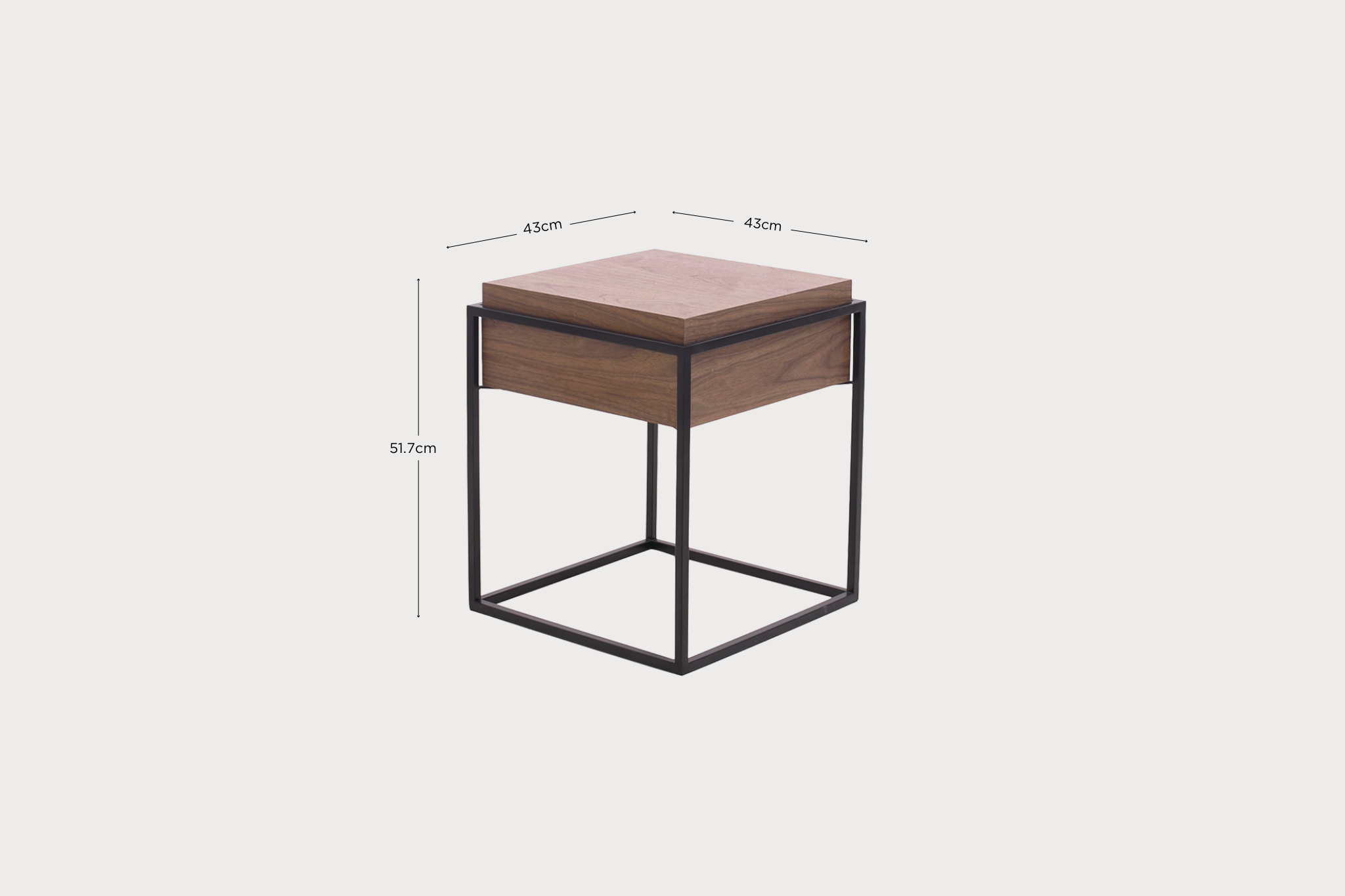 Complementando este diseño, la estructura de la mesita de noche AXEL está fabricada en metal con un acabado negro mate. Esta elección de material no solo asegura la durabilidad y estabilidad de la pieza, sino que también añade un toque moderno y refinado. El contraste entre la madera oscura y el metal negro mate crea una combinación armoniosa y estilizada, resultando en un mueble que es tanto versátil como estéticamente atractivo.