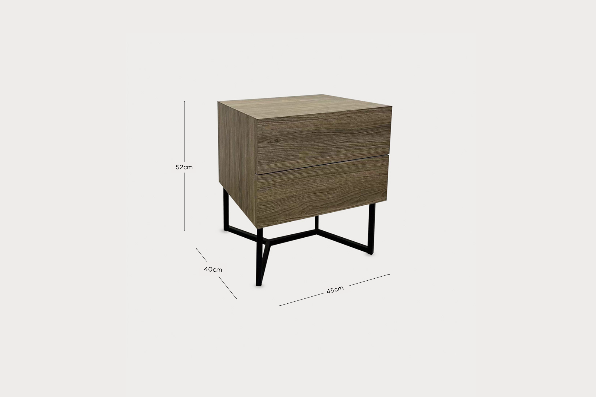 Descubre la mesita de noche GONZALO, una pieza que combina funcionalidad y estilo contemporáneo. Fabricada con una elegante mezcla de madera oscura y metal negro mate, esta mesita ofrece una solución práctica y moderna para tu dormitorio. Sus dos cajones proporcionan un amplio espacio de almacenamiento adicional, ideal para mantener tus pertenencias organizadas y al alcance.