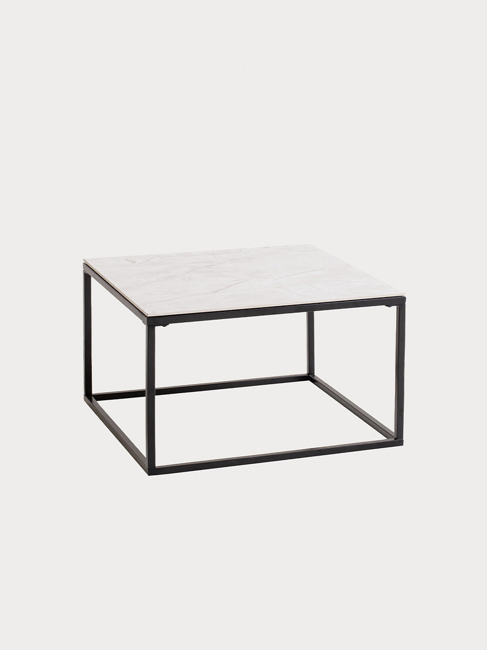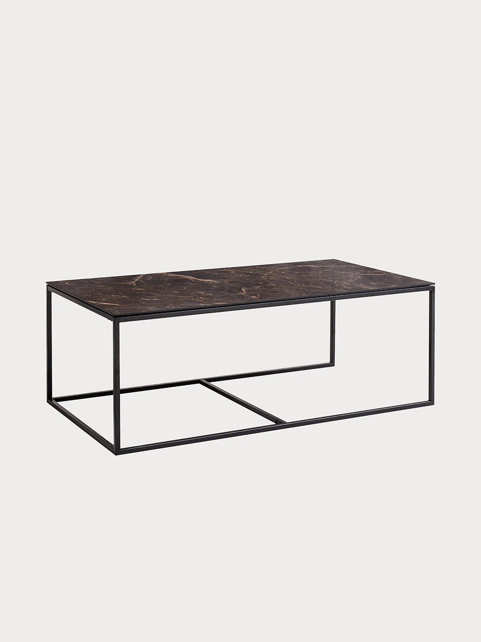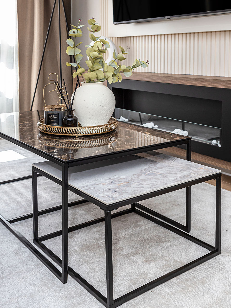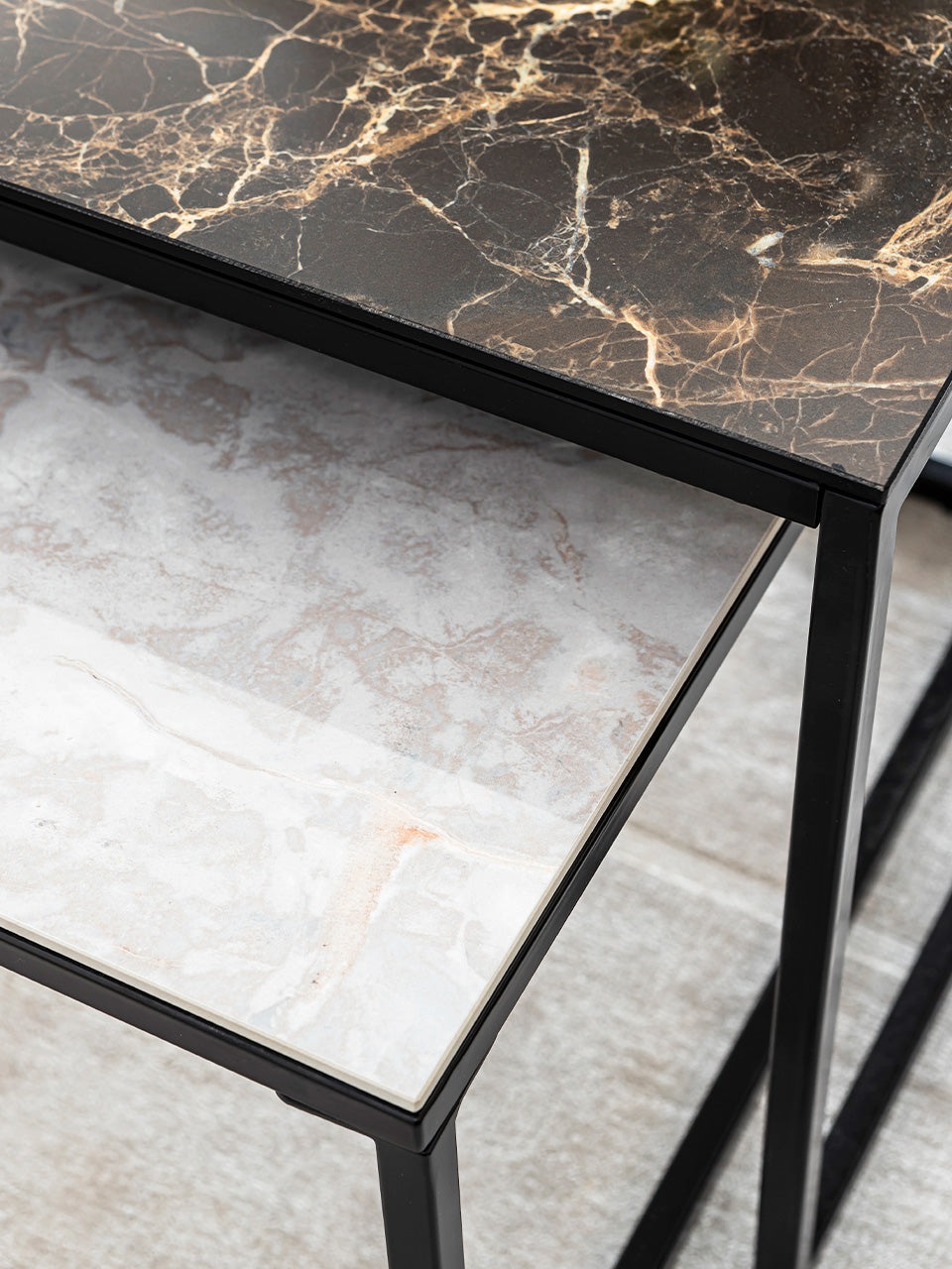 Set de dos mesas de centro de cerámica marrón y blanco con patas de metal negro