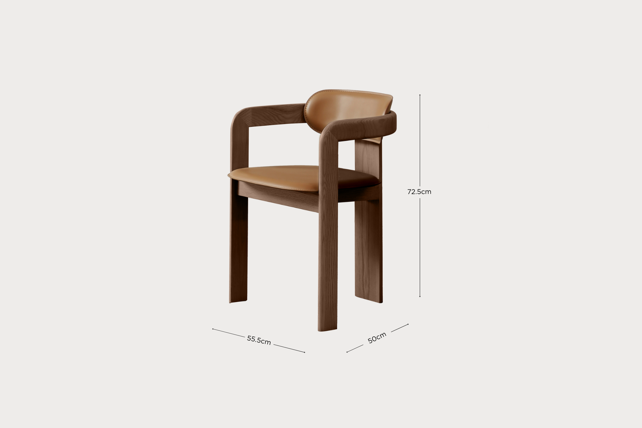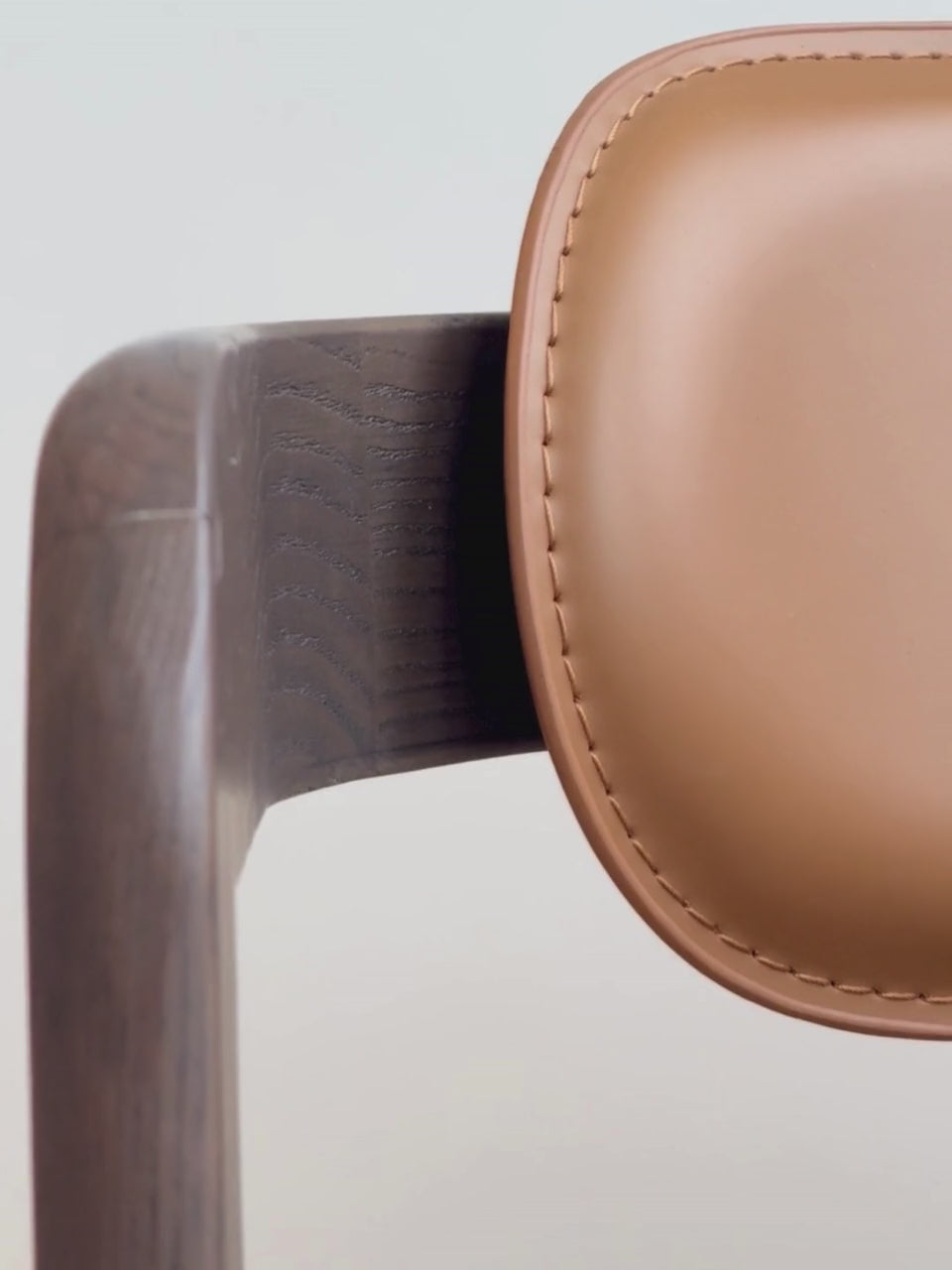 Complementando la estructura de madera, el asiento y el respaldo de las sillas están revestidos con cuero reciclado en un elegante color marrón. Este material le aporta un valor añadido a la pieza de lujo, refinamiento y de compromiso.