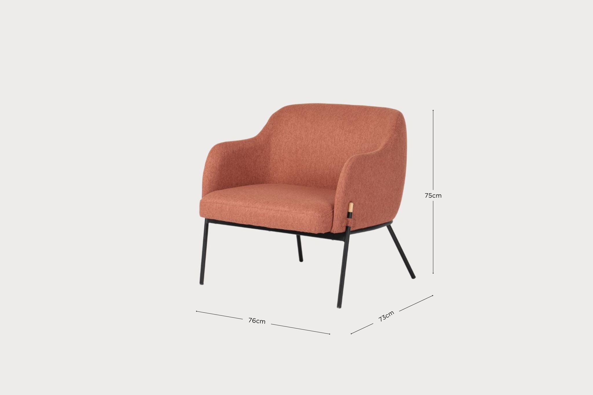 El sillón BRISEIDA con tejido de tela tono terracota y patas metálicas negras ofrece un soporte cómodo y firme, convirtiéndolo en el lugar perfecto para relajarse tras un largo día o disfrutar de una conversación amena con amigos.