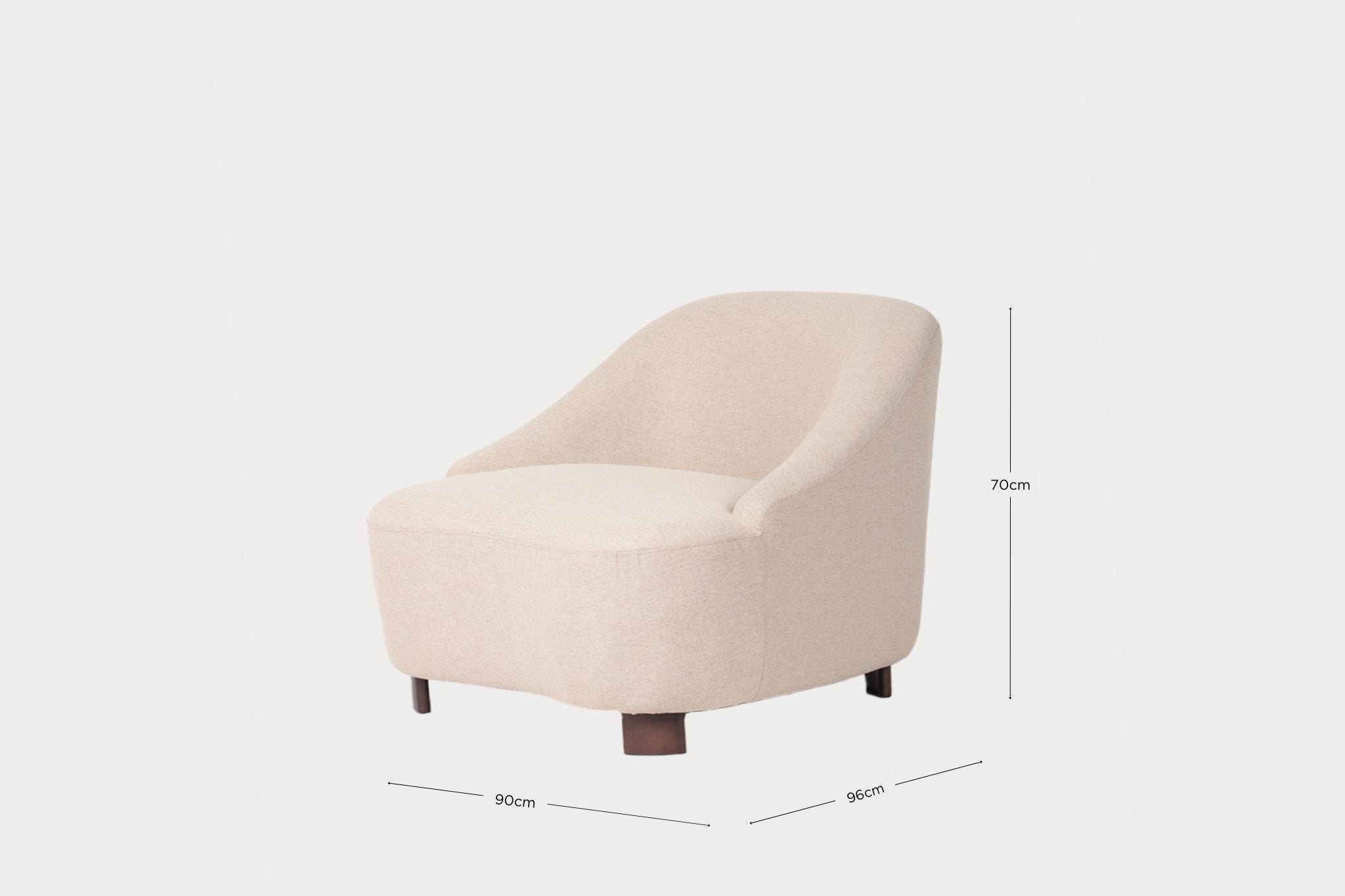El asiento está completamente tapizado en un tejido beige que destaca por su suavidad al tacto y su resistencia al uso diario, haciendo de este sillón una opción ideal tanto para espacios residenciales como para entornos más formales o contract.