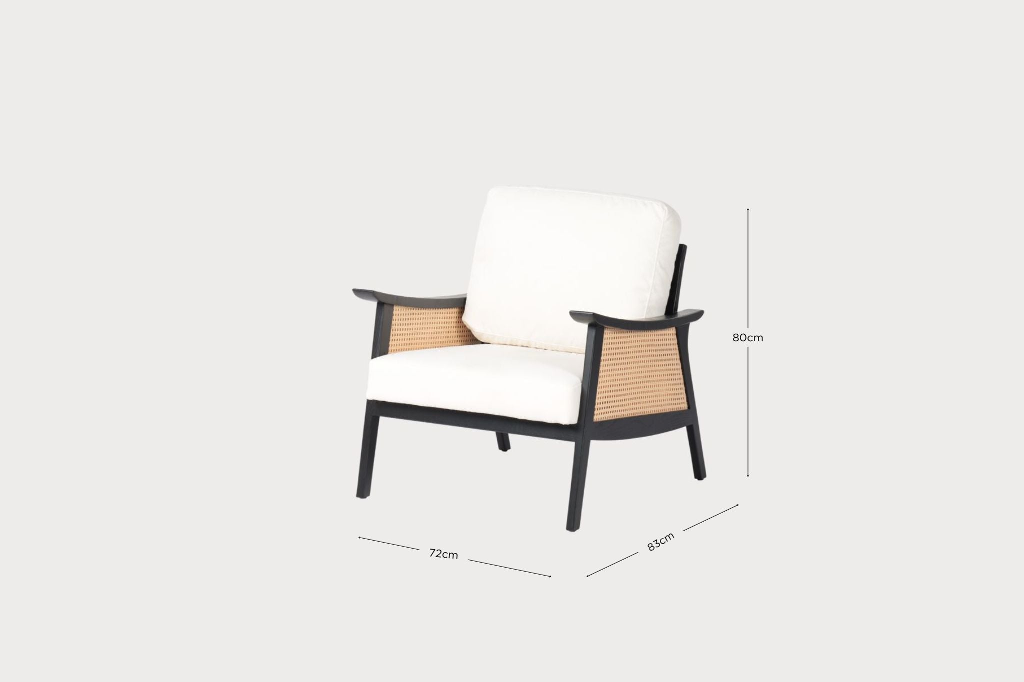 Este sillón es ideal para espacios interiores o exteriores cubiertos donde se desee crear una atmósfera relajada y elegante. La combinación del ratán con el tejido blanco acolchado lo convierte en la elección perfecta para salas de estar, terrazas o rincones de lectura.