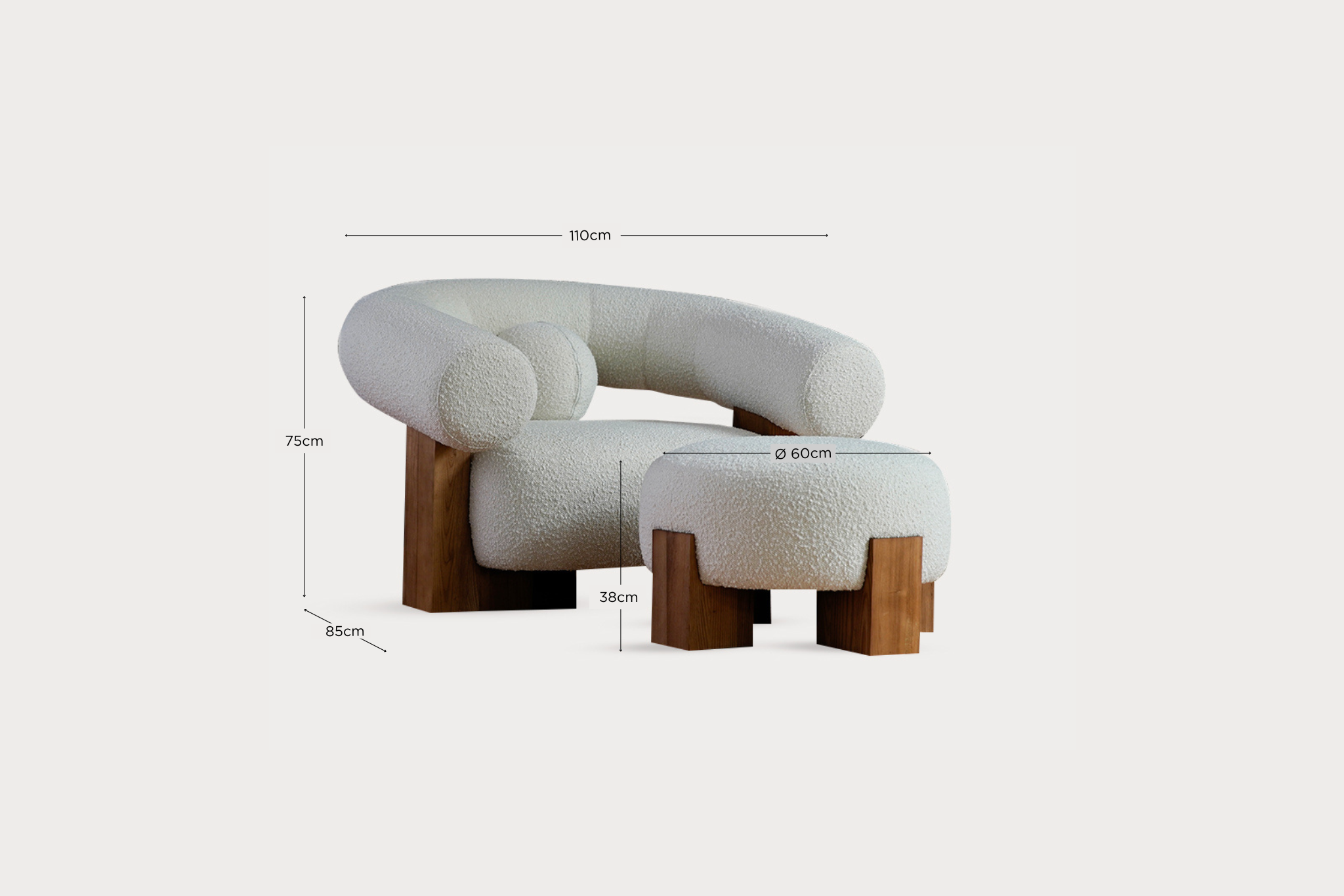 El tapizado en tejido bouclé añade un nivel extra de sofisticación y suavidad, brindando una textura agradable al tacto. Este tejido, además de ser duradero, está en tendencia, aportando un toque contemporáneo y refinado a cualquier espacio. El sillón NOA con reposapiés es una pieza perfecta para integrar en salas de estar, dormitorios o rincones de lectura, elevando el ambiente con su diseño elegante y cómodo.