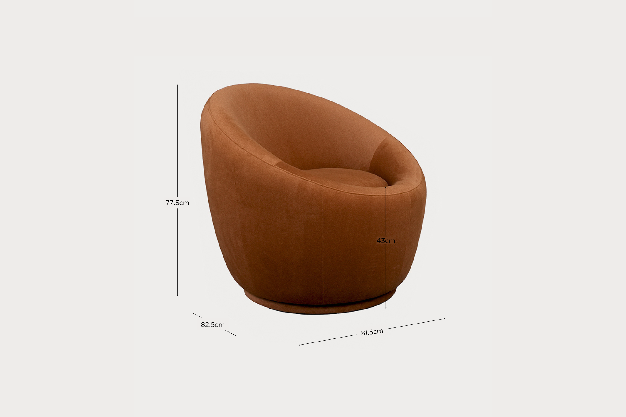 Tapizado en un suave terciopelo de color caqui, el sillón SELENE irradia elegancia y sofisticación, aportando un toque de distinción a cualquier espacio. El terciopelo no solo garantiza un acabado lujoso, sino también una textura agradable y suave al tacto. Además, su función giratoria añade una característica práctica, permitiendo un uso más versátil en el día a día.