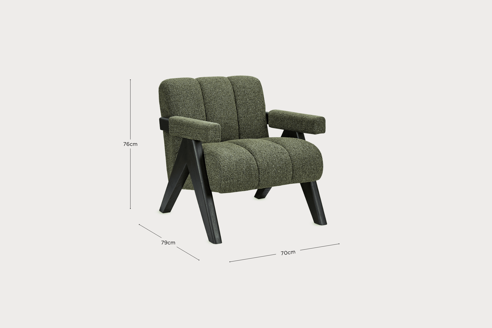 Las patas de madera en acabado negro no solo complementan el tejido verde, sino que también proporcionan estabilidad y resistencia, asegurando que el sillón LORETO sea una pieza robusta para el uso diario. Su diseño versátil lo convierte en un complemento ideal tanto para salas de estar principales como para rincones de lectura más íntimos, donde su estilo vintage puede destacar aún más.